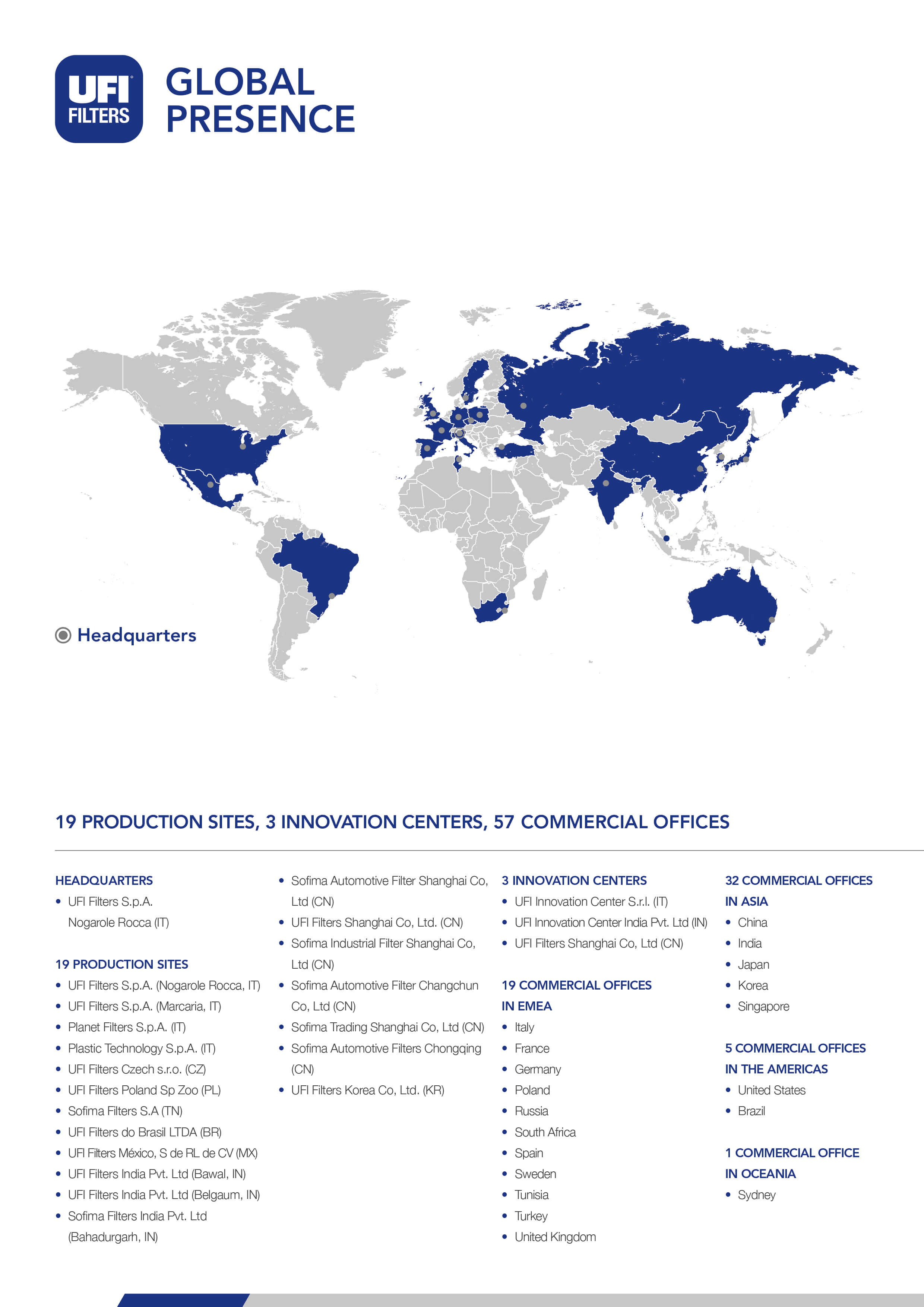 得益于領先的產品系列,包括完整過濾模塊、熱管理系統、零配件和過濾介質,集團深受世界汽車品牌的認可與信賴,如大眾集團、Stellantis、通用汽車、福特、日產雷諾、現代起亞、寶馬、戴姆勒股份公司、三菱FUSO、曼恩、凱斯紐荷蘭工業、沃爾沃和斯堪尼亞等品牌。目前,全球95%汽車制造商選擇將UFI集團的產品系列應用于其傳統動力、混合動力和電動車型。